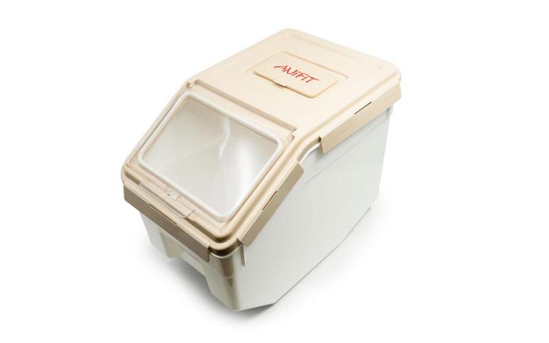 Pratico contenitore per alimenti secchi che può contenere fino a 5 kg di cibo. Si possono così riporre facilmente i sacchi grandi in cantina e avere sempre il pratico contenitore piccolo a portata di mano in cucina.