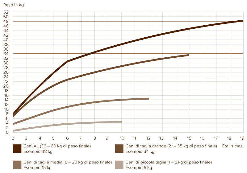 Non si deve nutrire un cane con cibo per cani adulti fino a quando il cane non è completamente cresciuto. Le razze piccole sono completamente sviluppate a circa 10 mesi di età, le razze medie a 12 mesi e le razze grandi e giganti a circa 18-24 mesi. Nel primo semestre si verifica il maggior aumento di peso e di dimensioni. Per informazioni più dettagliate, chiedi all'allevatore o all'associazione della razza le fasi di crescita del giovane cane.